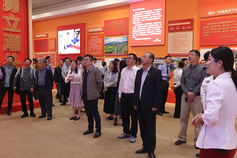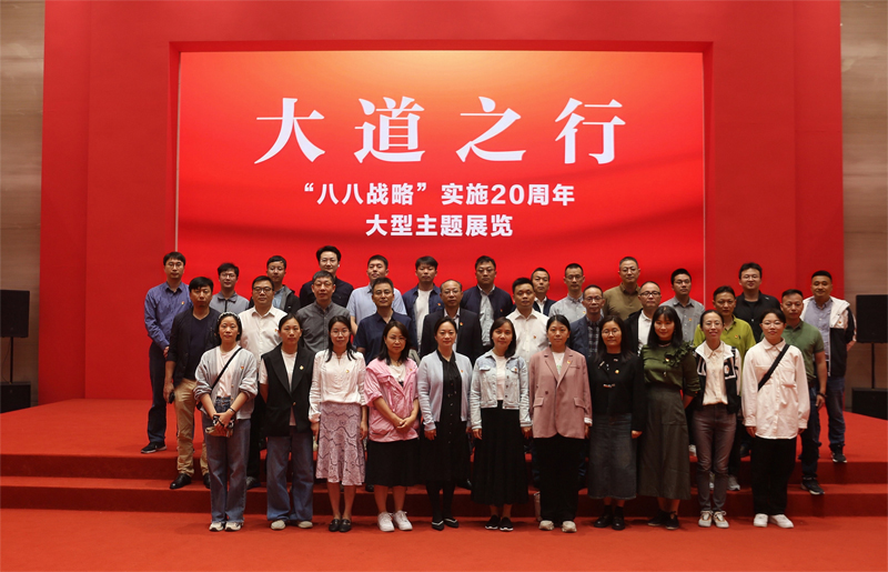 本次主题展览是省委部署开展的“八八战略”实施20周年系列活动之一。展览分为“伟大擘画、精彩蝶变、勇立潮头”综合展区和“共谱华章”地方展区,以丰富的实物、图片、文字和多媒体形式,全面展示了“八八战略”实施20年来取得的伟大成就和宝贵经验。置身主题展览现场,如同开启了一场精彩纷呈的“时空之旅”。在一张张生动的历史图片、一件件厚重的文献实物、一段段精彩的视频资料前,大家认真聆听讲解,不时驻足停留,深刻感受习近平总书记在浙江工作时走过的足迹、擘画的印迹、牵挂的心迹,切身体会习近平新时代中国特色社会主义思想在浙江的实践探索历程。