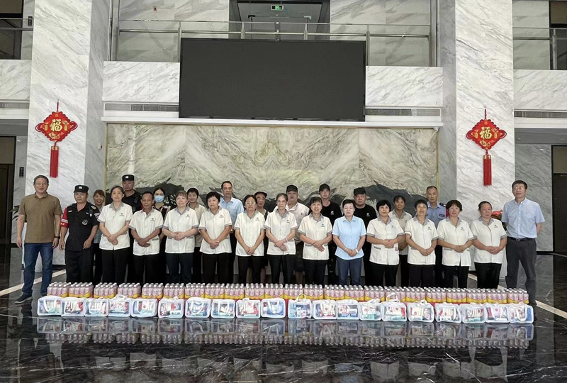 8月18日,马茂灯副总经理为大楼内保安、保洁和食堂人员送上清凉慰问品。